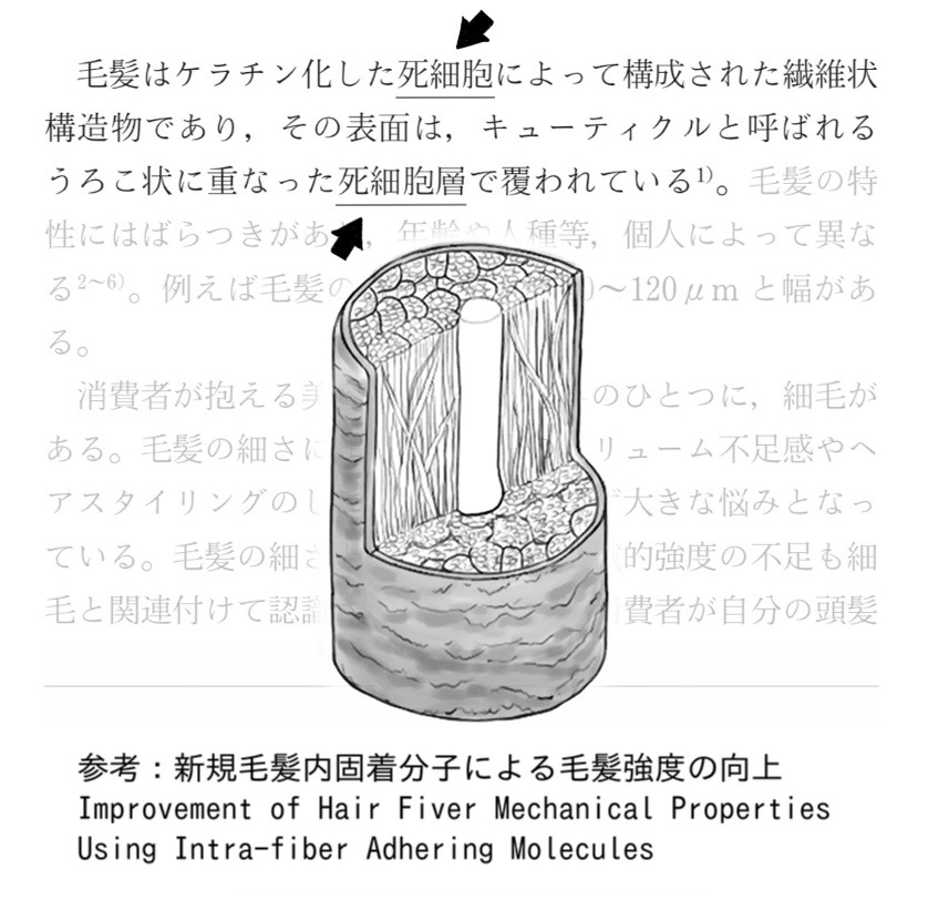 ……というのも詳しい人はご存知かと思いますが、髪は硬ケラチンと呼ばれる硬くなった死細胞(=既に死んでいる細胞・タンパク質)で出来ています。