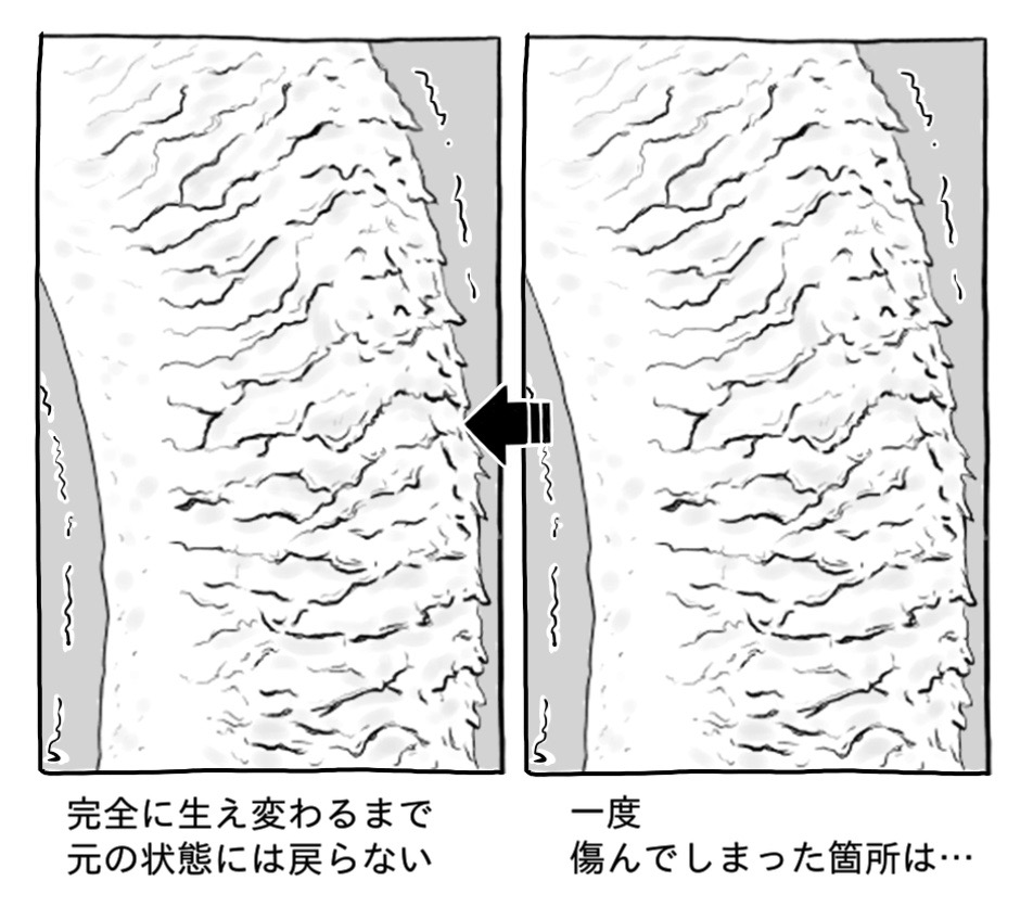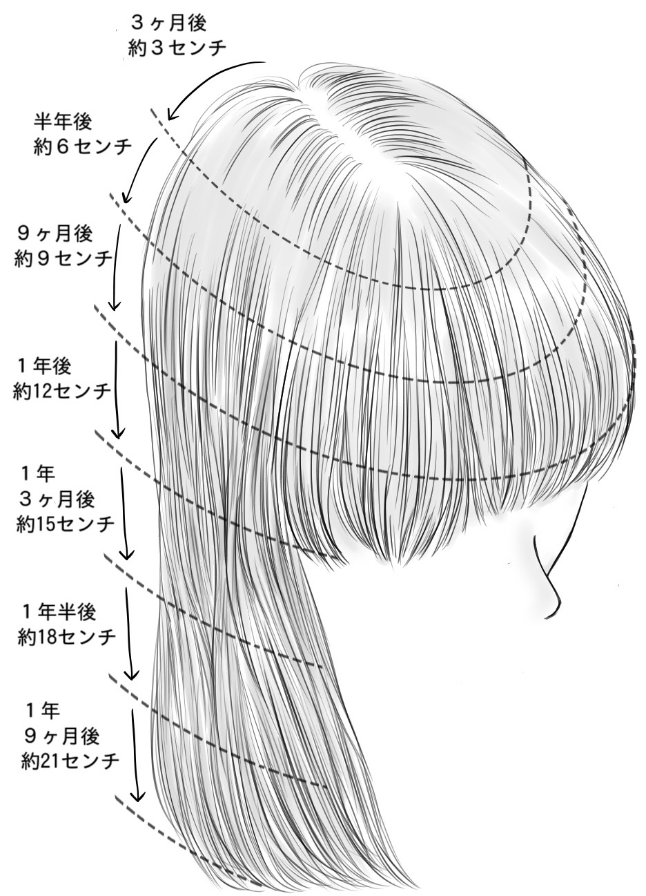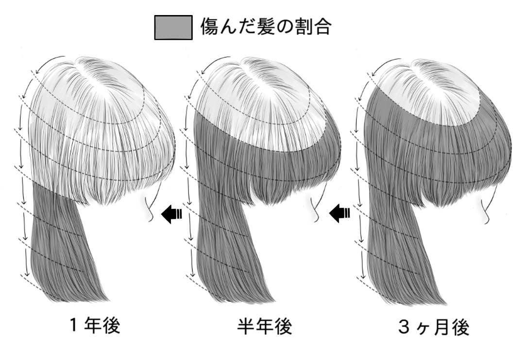 そうやって徐々に傷んだ髪の割合を減らし、ダメージの少ない髪の割合を増やしながら、最低でも半年〜1年程度の時間をかけ、髪全体のコンディションを良い状態へ持っていくことが重要になります。