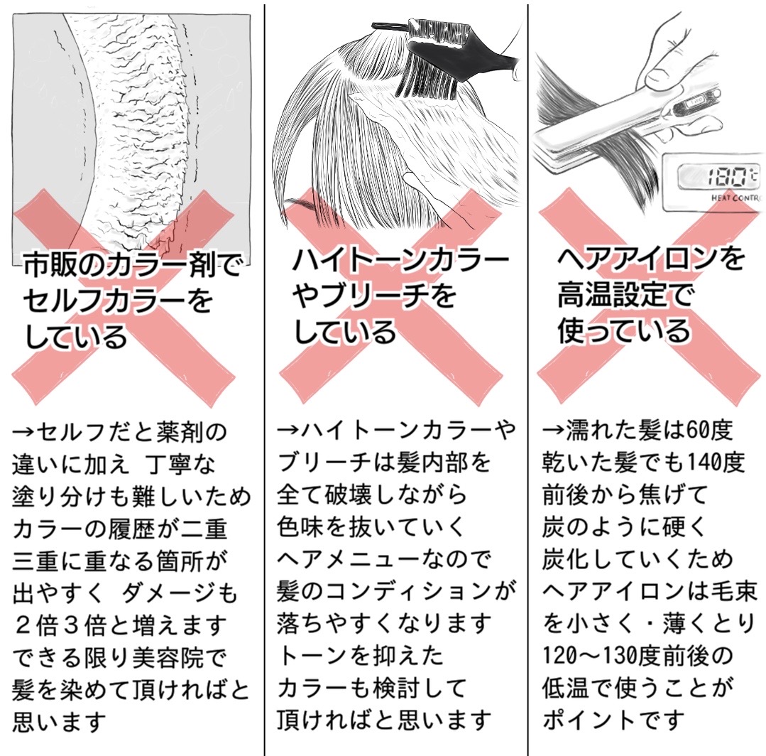 加えて、それ以外のヘアケア・ヘアメニューでも下記のような髪への負担やダメージになることはなるべく避けること。
