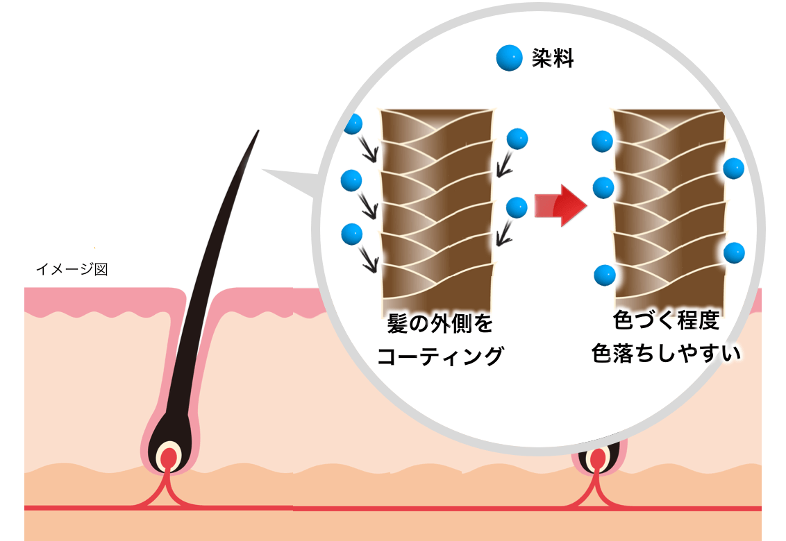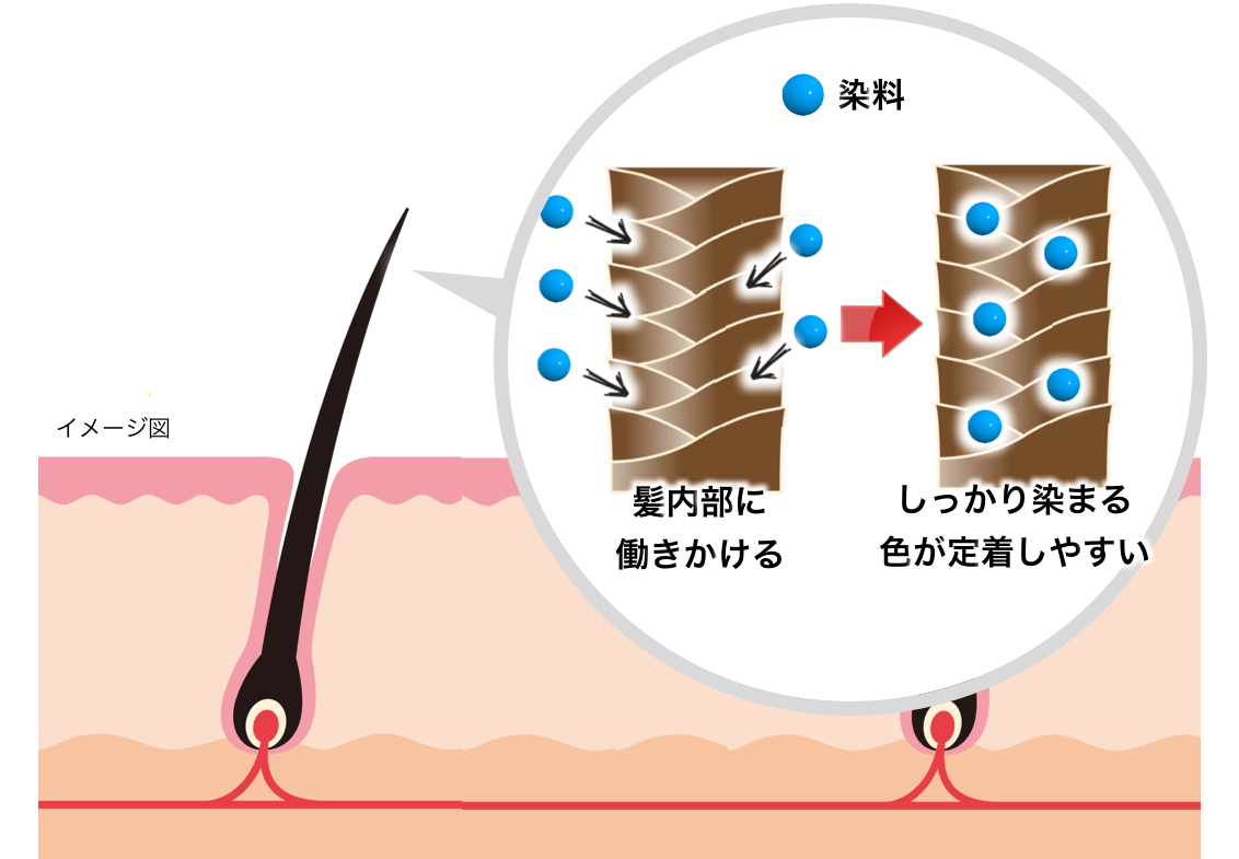 薬剤で髪内部に直接働きかけることで、白髪がしっかり染まるだけでなく、色落ちがしづらく、色が定着しやすい、といったメリットを期待することができます。