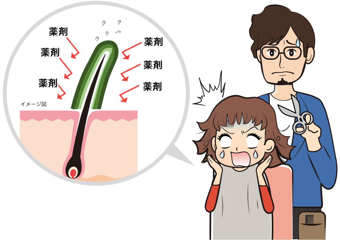 かなり強めに設定された薬剤によって、使用回数を重ねるごとにダメージがどんどん蓄積され、パサつきや、枝毛の原因になってしまうケースもございます。