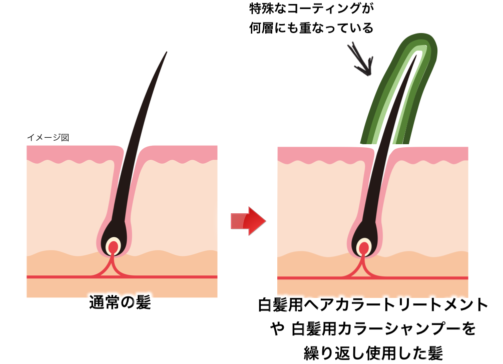 言ってみれば、ある種、特殊なコーティングが何層にも重なって白髪が染まっている状態です。