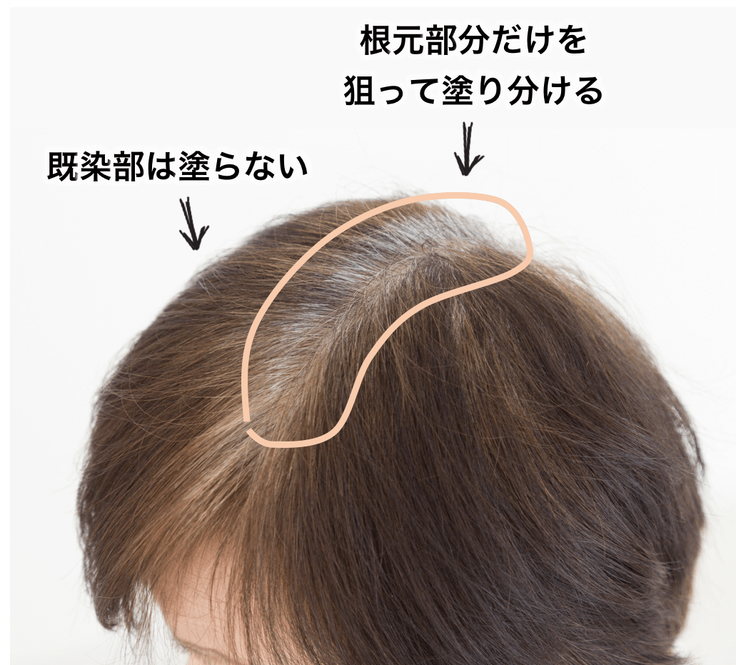 既に白髪染めされた部分(既染部:きせんぶ)と新しく伸びてきた根元部分(新生毛:しんせいもう)を塗り分けることは困難であるため