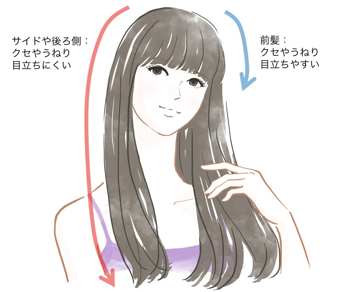また、ミディアム以上のロングヘアの方など、前髪とそれ以外の箇所にクセやうねりの差(ギャップ)が出やすい方の場合は