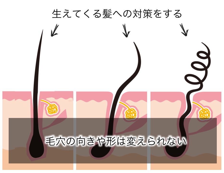 逆に言えば、これから生えてくる髪に直接働きかけることや毛根の形を変化させること、また、根本的な部分で地毛の髪質をくせ毛→直毛に変えていくことはできません。