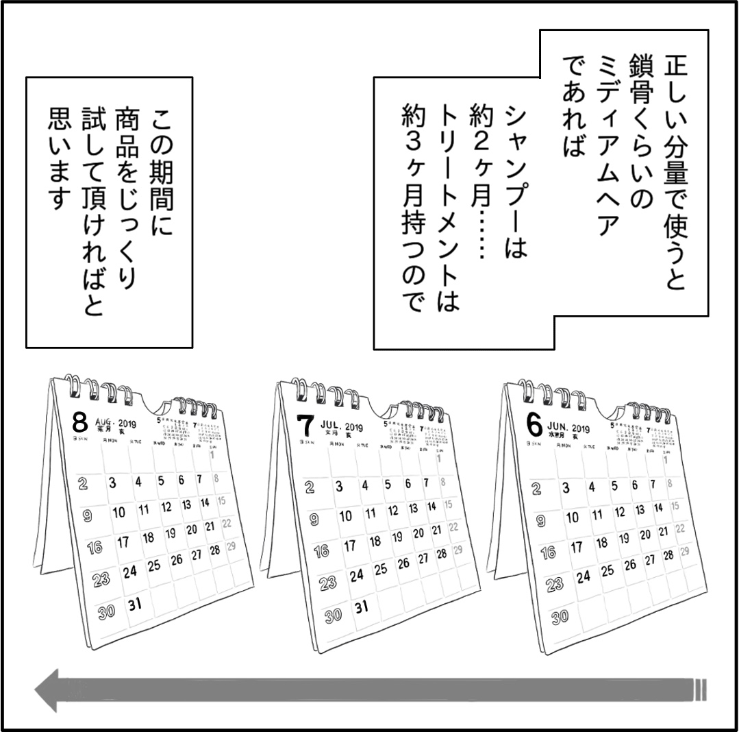 正しい分量で使うと鎖骨くらいのミディアムヘアであれば、シャンプーは約2ヶ月、トリートメントは約3ヶ月持つので……