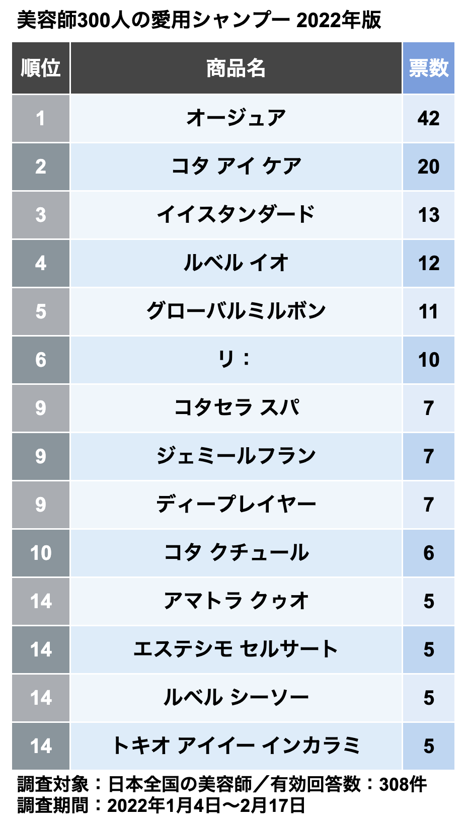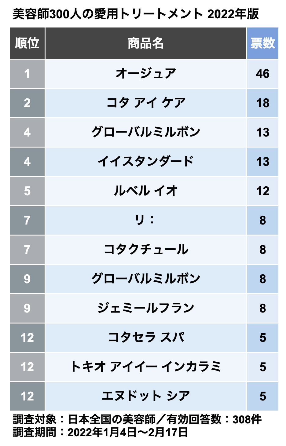 ※なお、下記が2022年1月に実施した「美容師300人の愛用シャンプー/トリートメント調査(ランキング)」の結果です。